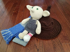 I was contacted by an old friend, Her younger sister was expecting her first child and she was in charge of the baby shower. She wanted to see if I could make a Dobby doll from Harry Potter. I went looking but I hated the free patterns that were available and didn't want to have to pay for a pattern. So I returned to the above pattern and applied a few changed. First I did some color changes on the feet to make it look like little Dobby is wearing a sock. Second, the head had to me made separately and without a pattern so I could shape his nose. Its worked in rounds from the tip of his nose to the back of his head. I added ears and crochet him up a rag shirt to wear. Along with the doll I made a newborn sorting hat and a scarf in Ravenclaw colors using a simple moss stitch.